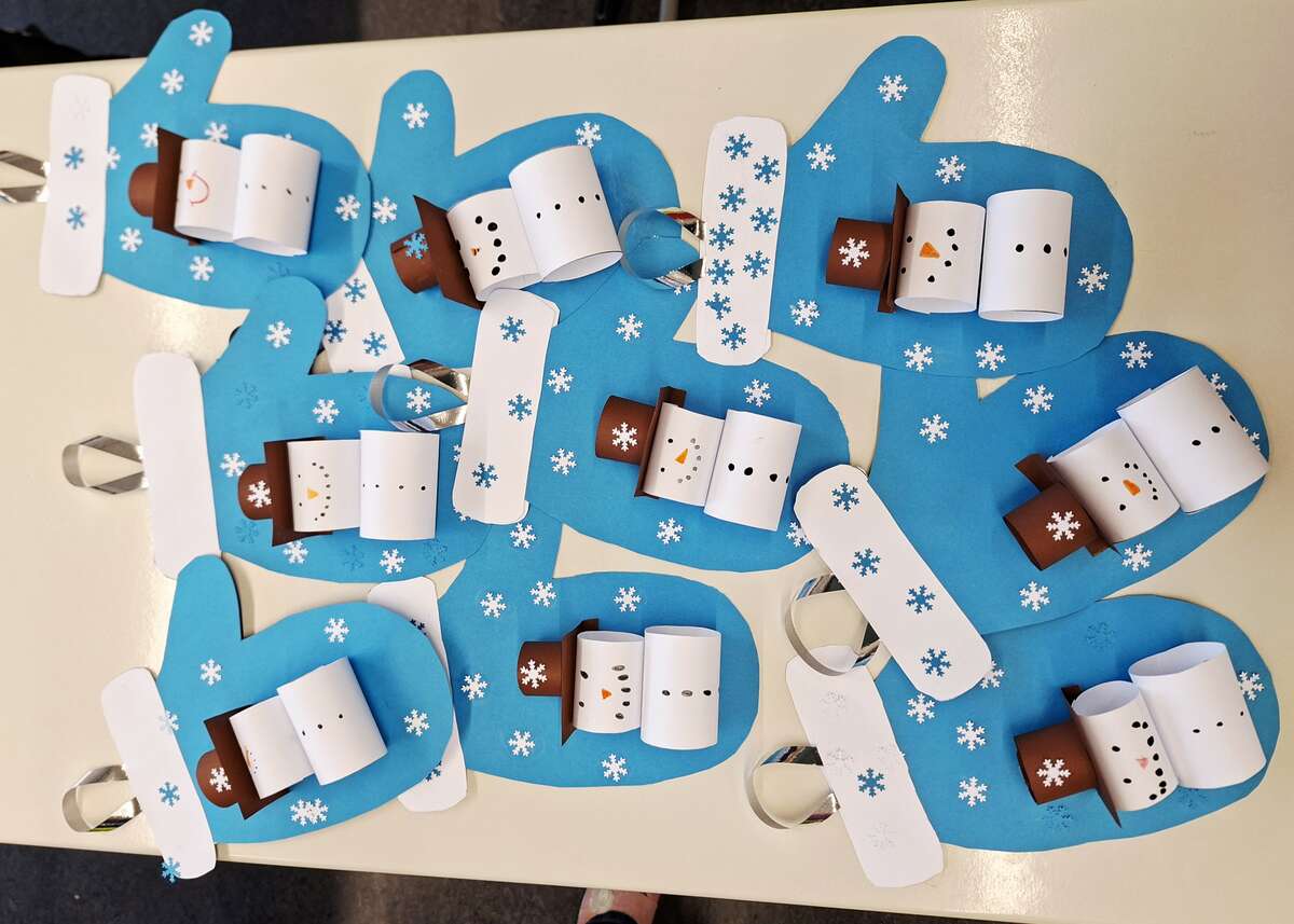 Während sich die Kinder beim alljährlichen Weihnachtsparcour in der Sporthalle nach Herzenslust austoben konnten, ging es beim Vorlesen der Weihnachtsgeschichte am Kamishibai gemütlich und besinnlich zu. Kreativ tätig waren die Kinder in der Küche, wo zerlaufene Schneemänner aus Keksen und Dominosteinen hergestellt wurden, die nicht nur toll aussahen, sondern auch lecker schmeckten. Abgerundet wurde das Angebot mit weihnachtlichen Spielen sowie Bastelaktionen, bei denen Tannenbaumnagelbilder, Schneemannkarten, Nikolausaufsteller und Schneemannmobiles gefertigt wurden. Und so erlebten die Kinder einen außergewöhnlichen Schultag, der allen viel Freude bereitete und an dessen Ende die Kinder stolz ihre selbsthergestellten Bastelarbeiten und Keksschneemänner nach Hause trugen.